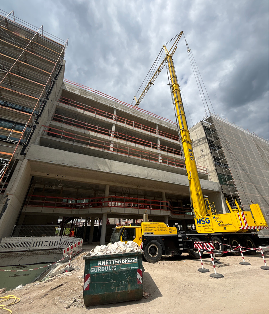 Im Gebäude, welches ganz nach dem Prinzip „New Work“ ausgerichtet ist, um moderne und flexible Arbeitskonzepte stärker zu verwirklichen, entstehen Büro- und Kollaborationsflächen wie Design-Thinking-Räume, sowie eine Kantine und ein Restaurant.